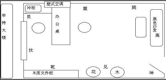看完楼号,我们又来到崔总的办公室。办公室不很宽敞,我分好八卦方位,见其背对窗户坐在东北方艮位,身边的墙上挂有壁式空调,手边放有一个小冷藏柜,断其工作繁忙,经常开车到处跑,没有安闲的时间,胃寒胃痛胃胀,大肠有问题;见其在西北方乾位摆放有一组柜,里面的书未摆满,断其积蓄尚可;见其在西方兑位摆放几盆花木,断其心直口快,与领导有争执,经常头痛;见其在南方离位摆放一个黑色沙发,断其心脏不适;见其办公桌正面对南方半透明的磨砂玻璃墙,断其眼睛已花。反馈全部正确。